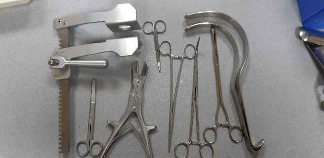 Matériel chirurgical : scalpels, ciseaux, écarteurs, pinces hémostatiques,